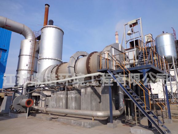 采用重油、廢溶劑為加熱介質(zhì)。將在流化造粒塔生成的含有機(jī)物的混合污鹽加入回轉(zhuǎn)焙燒爐內(nèi)焙燒。在高溫下污鹽中的有機(jī)物氣化熱解。焙燒后的無機(jī)鹽外送綜合利用或填埋。焙燒產(chǎn)生的煙氣經(jīng)焚燒爐二次焚燒,將煙氣中有機(jī)物完全氧化成CO2、H2O、HCl、S